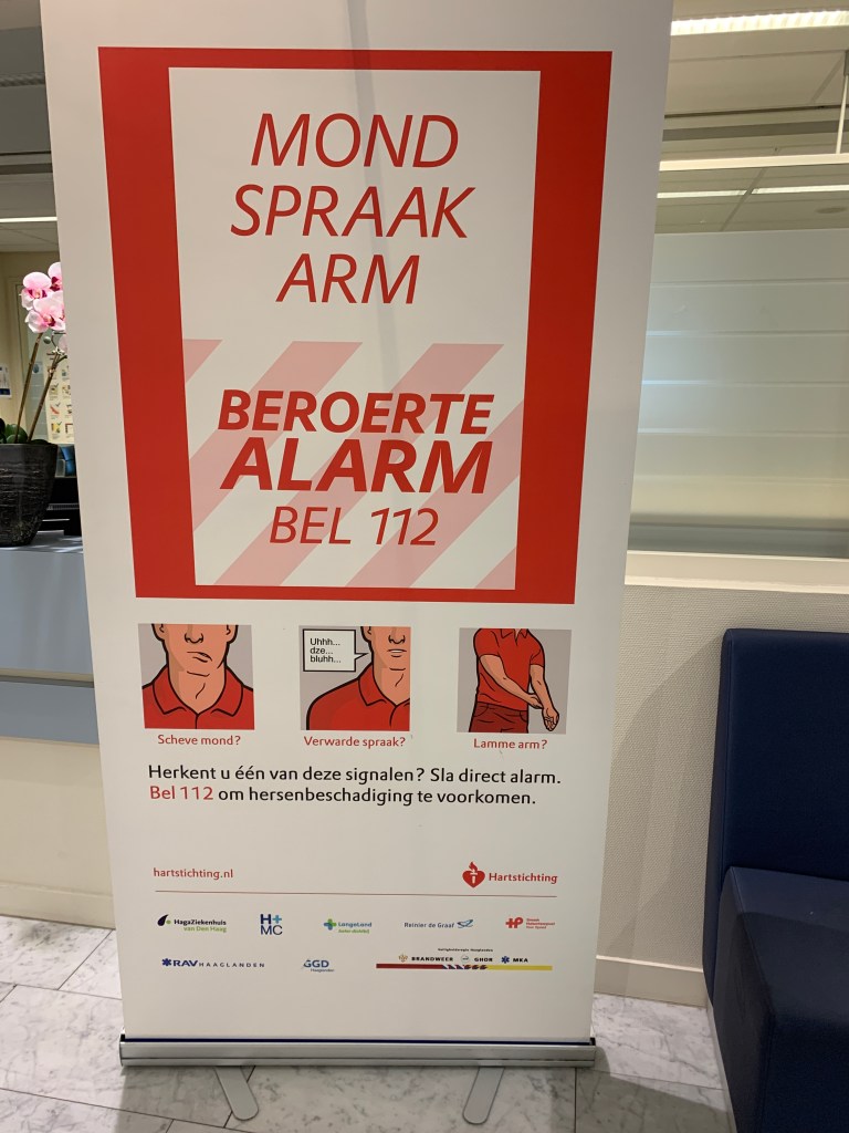 Op de begane grond was de oogarts en onderweg liep ik iedere keer langs een poster die iets aangaf van mond, spraak, arm en dat er dan sprake kon zijn van een beroerte. Het voelde zo raar. Ik had last van al die dingen, maar een beroerte dat is toch iets heel heftigs? Hier had de dokter niets over gezegd. Hij had gezegd een sinus trombose, dat is toch wat anders? Daarbij had ik wel last van die dingen, maar het was bij mij alleen toch een hoofdpijn?